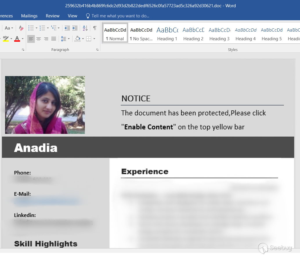 诱饵文件可能是通过鱼叉式钓鱼邮件(Anadia Waleed)分发的,起初,我们认为它的目标是印度,但实际上的受害者可能会更广泛。