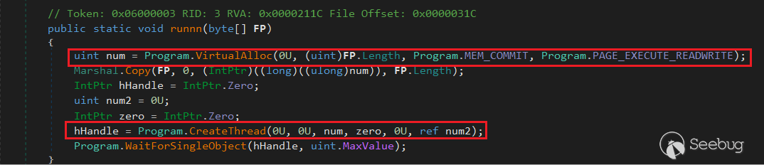 解密的内容将复制到分配的内存区域,并使用VirtualAlloc和CreateThread API作为新线程执行。