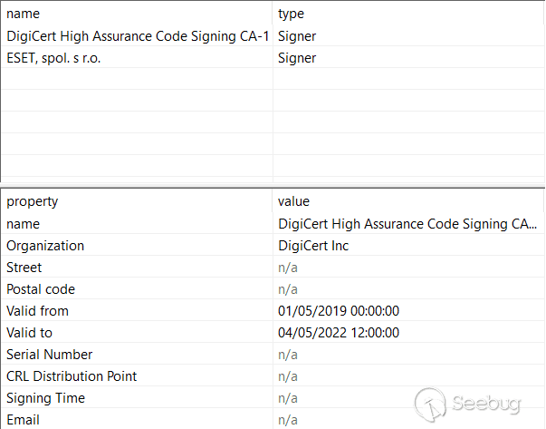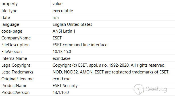 可执行文件使用无效的证书进行了签名以模仿ESET,其版本信息显示这是一个“ESET命令行界面”工具。