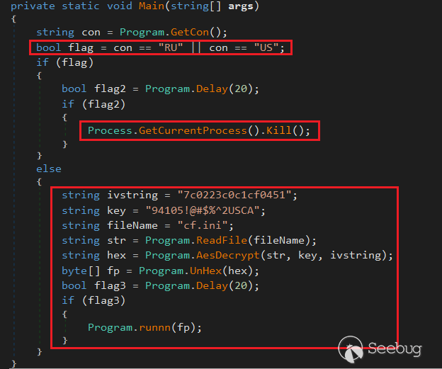 如果国家/地区代码是“RU”或“US”,则退出;反之将使用硬编码密钥和IV对“cf.ini”的内容进行解密。