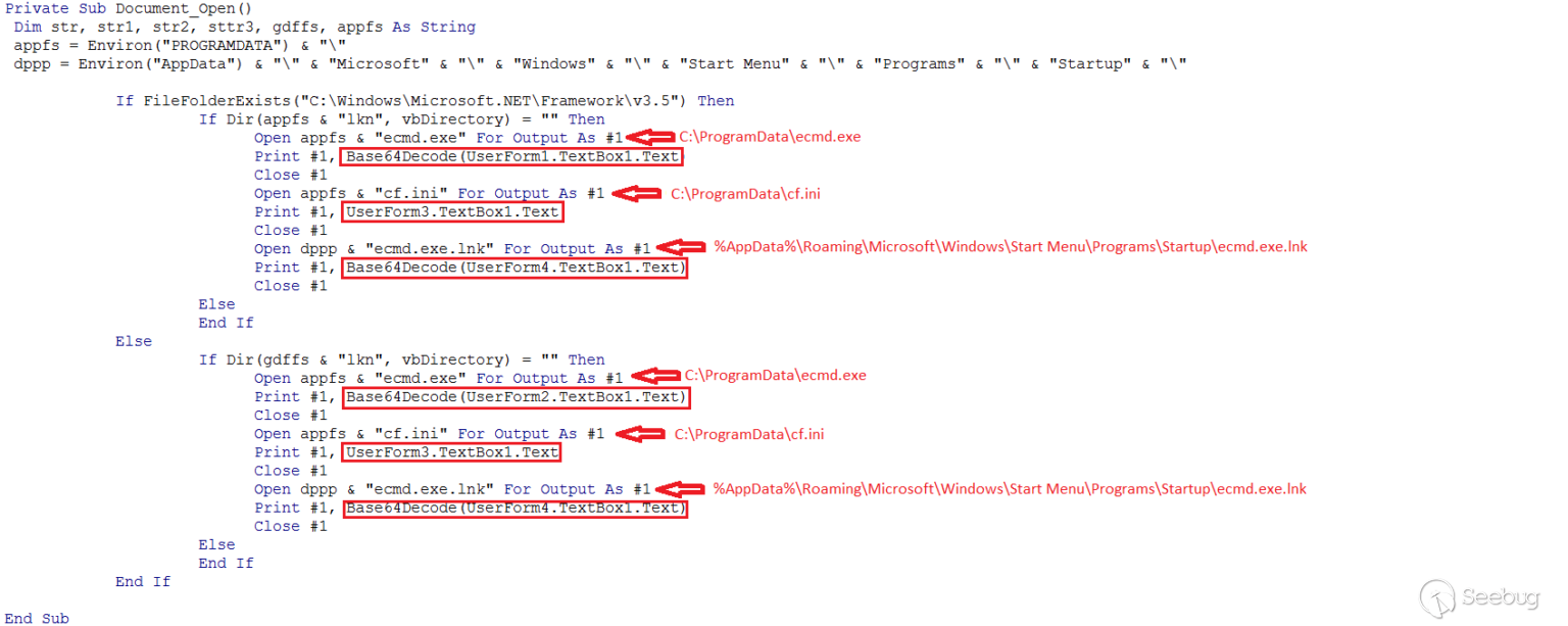 - Ecmd.exe:UserForm1和UserForm2包含两个Base64编码的有效负载。根据受害者计算机上安装的.Net框架的版本,UserForm1(对于.Net v3.5)和UserForm2(其他版本)的内容将被解码并存储在“C:\ProgramData”中。