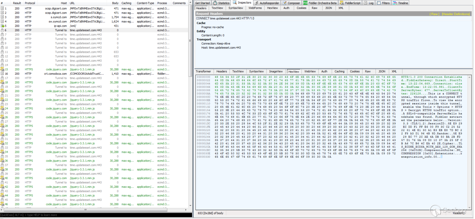 将有效负载复制到内存中的缓冲区后,shellcode跳到缓冲区的开头并继续执行。这包括向“time.updateeset[.]com/jquery-3.3.1.min.js” 发送连续的请求,并等待来自C2的潜在命令。