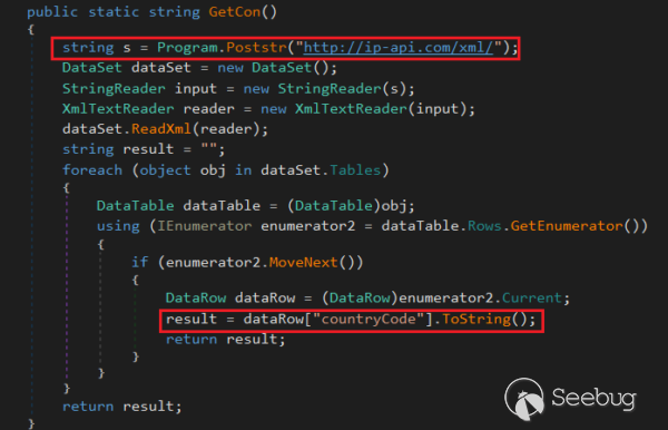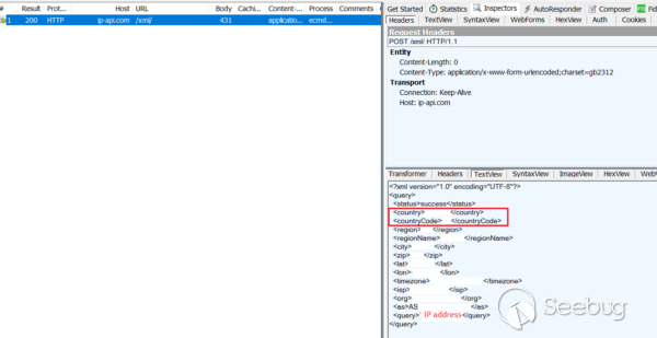 ecmd.exe是一个小型加载程序,它解密并执行前面提到的AES加密cf.ini文件。通过向http://ip-api.com/xml发出HTTP请求来检查受害者国家的机器,接着解析XML并提取国家代码。