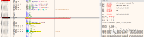 Shellcode首先使用PEB 查找ntdll.exe的地址,然后调用LoadLibrayExA加载Winint.dll。接着使用InternetOpenA、InternetConnectA、HttpOpenRequestAI、nternetSetOptionA和HttpSendRequestA API来下载第二个有效负载。