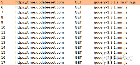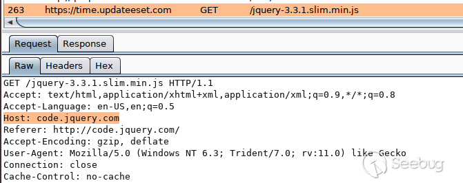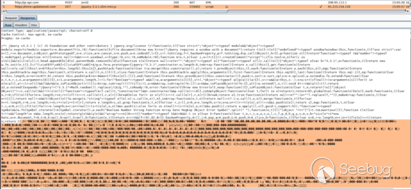 使用Burp Suite代理能够成功地验证并捕获从time.updateeset[.]com/jquery-3.3.1.slim.min.js下载的正确负载。如图所示,有效负载包含在HTTP响应返回的jQuery脚本中: