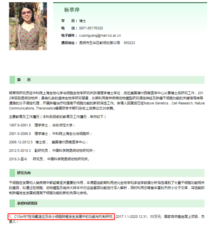 而杨翠萍博士的官网页面中,也显示着其承担过的一个科研项目,题为《C10orf67 在低氧适应及非小细胞肺癌发生发展中的功能与机制研究》。