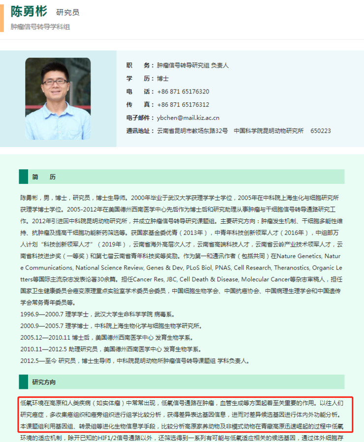 在陈勇彬博士的“研究方向”中可以看出,其研究与陈灵石的研究如出一辙——“利用进化学方法解析高原哺乳动物低氧适应的分子机理,同时能为人类疾病特别是实体瘤的研究、诊断或治疗提供新的靶点”。