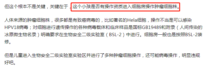 小孩进入细胞房操作肿瘤细胞株,明显违规。