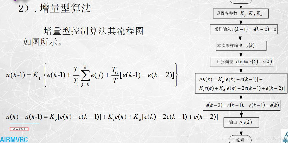 同样增量型的pid算法,就是从位置型推出来的,你把u(k)-u(k-1)化简一下就能得到下图那个式子。还是盗用老师课件的图: