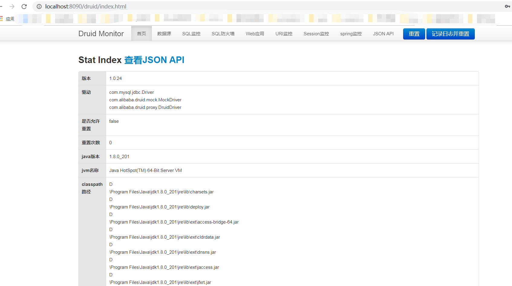 访问 http://localhost:8090/druid/index.html 即可看到监控日志信息, springsecurity登录账号密码为user/ 密码即为上述配置文件中的 user/user