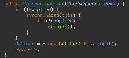 在方法Pattern.matcher 具体实现中通过synchronized来保证线程安全。