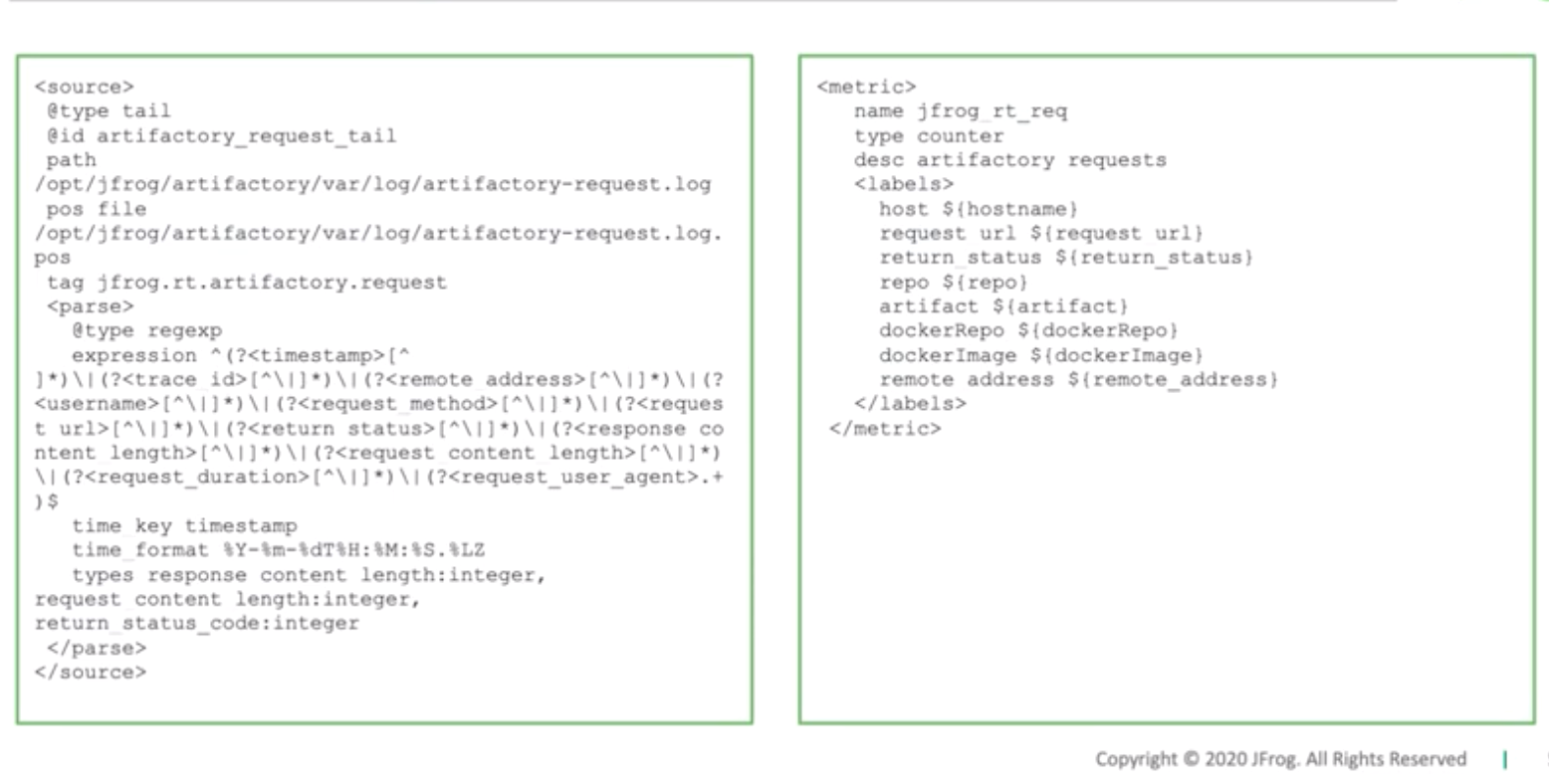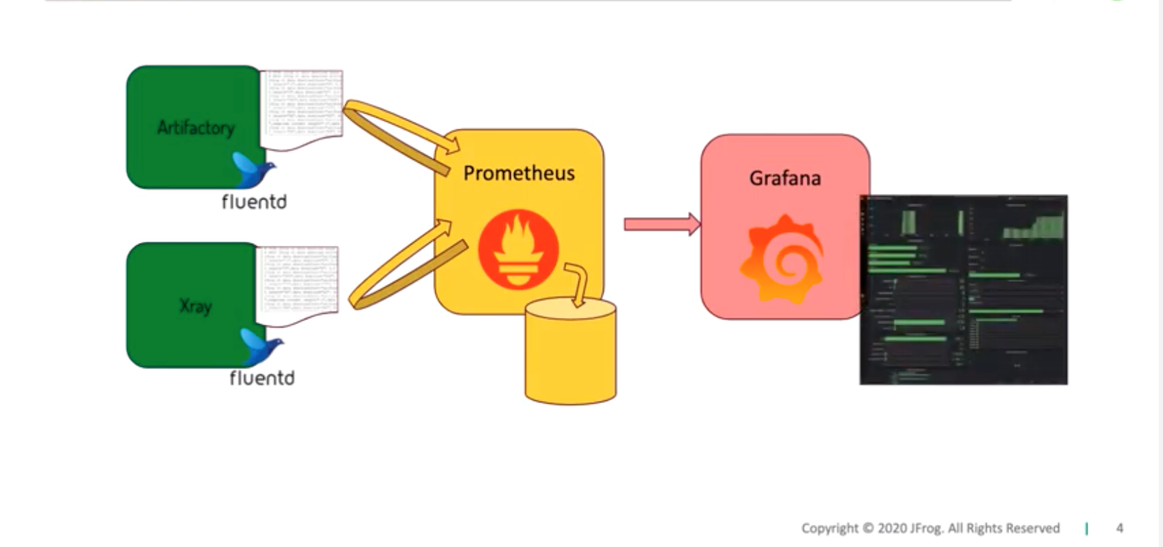FluentD使用文本配置文件进行配置,该文件包含输入源,过滤器和输出链。Prometheus FluentD插件提供用于配置Prometheus指标的语法。在我们的案例中,我们将Artifactory和Xray日志事件转换为Prometheus的指标。我们已经在这里设置了Artifactory和Xray FluentD配置示例。