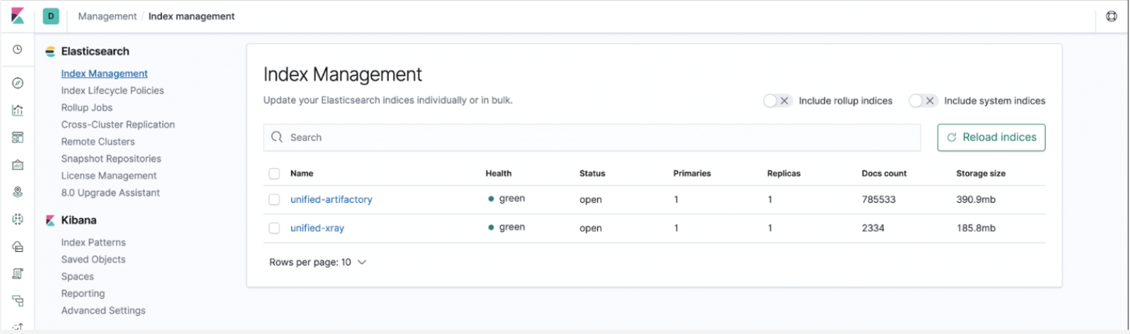 通过Kibana,在每个Artifactory和Xray Pod中安装Fluentd并运行td-agent的情况下,您可以在Kibana索引管理页面中看到生成的索引,如下图: