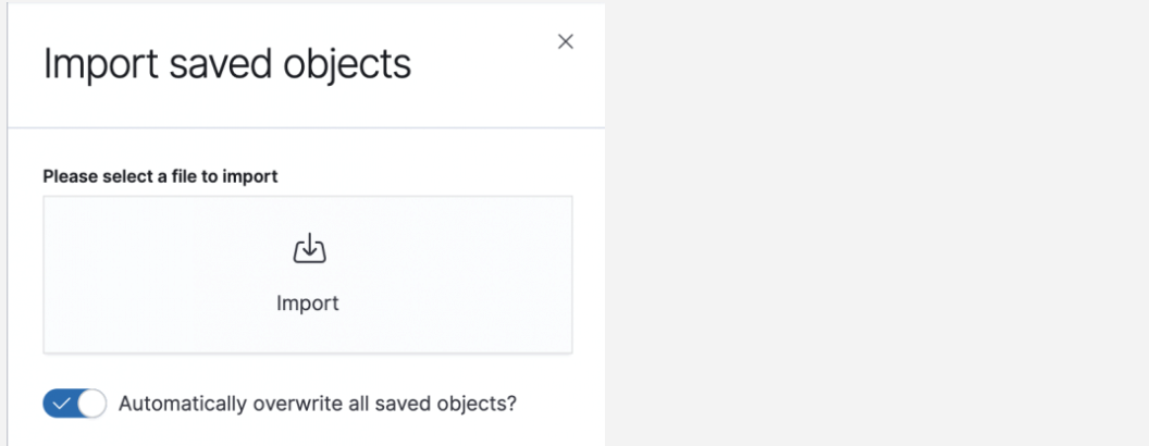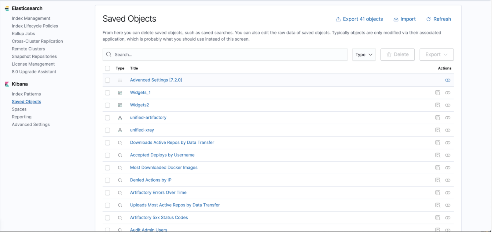 同时JFrog集成提供了一个NDJSON文件,该文件定义了索引模式和可视化配置。可以通过“ Kibana保存的对象”页面导入该文件。单击“导入”按钮导入该文件。