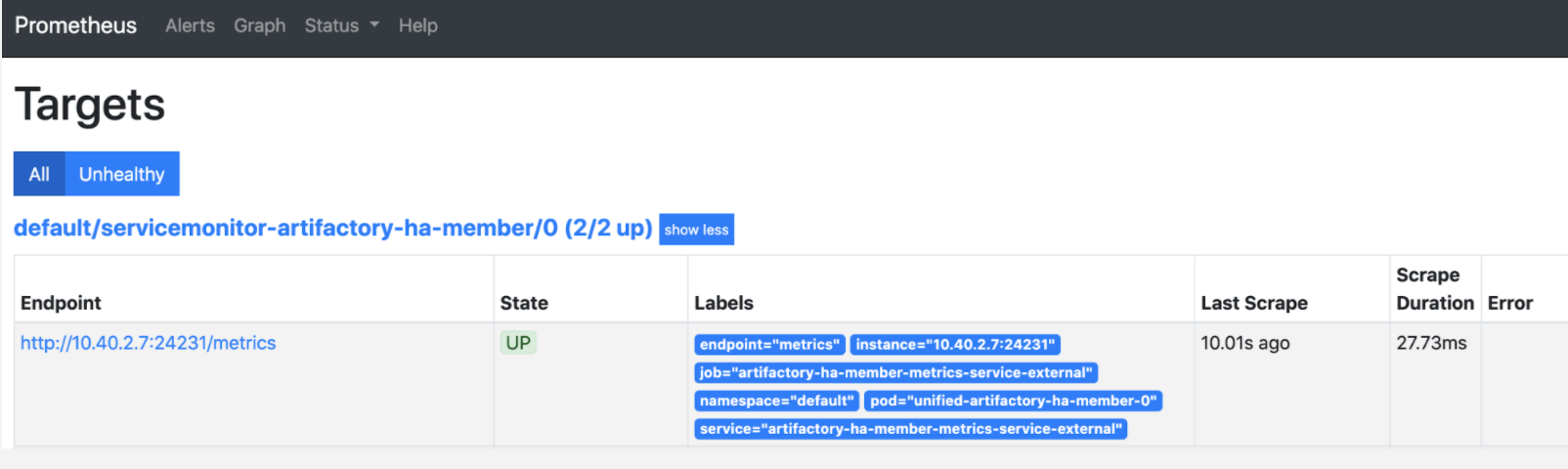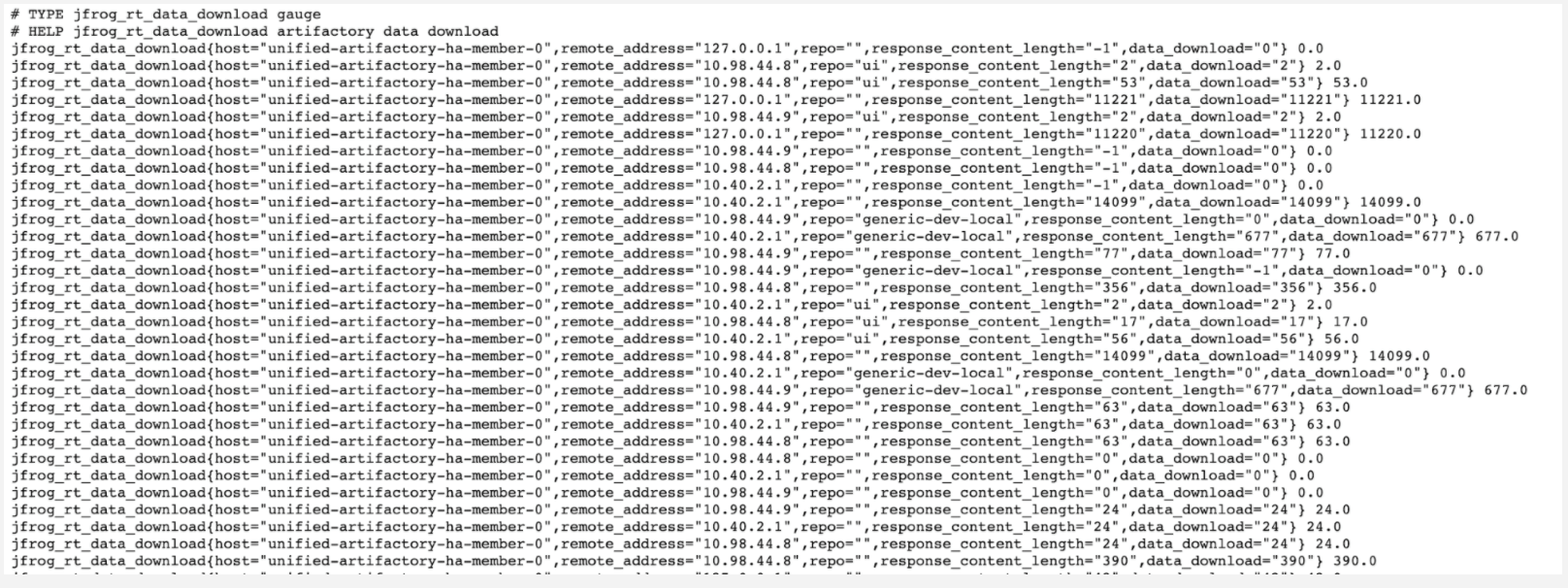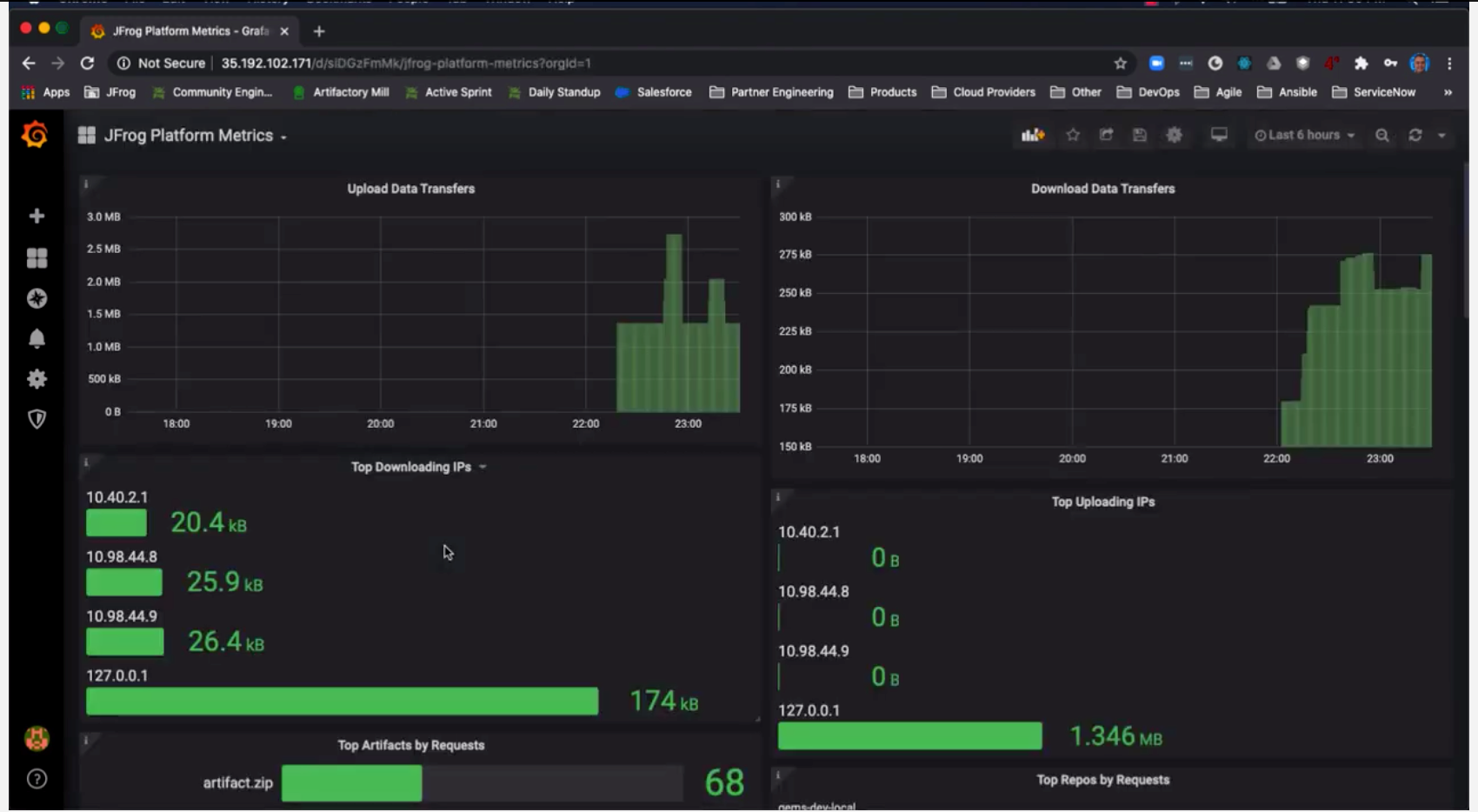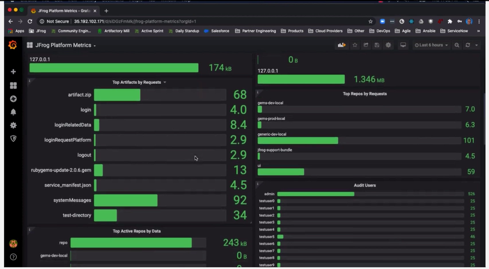 云原生环境本身会提供基础的资源监控,但是缺少足够的应用内部监控用于更好的进行运营决策,为了增强您监控能力,我们使用Promethus和Grafana套件进行监控,并提供了相应的集成配置手册:JFrog log analytics solution for Prometheus and Grafana.