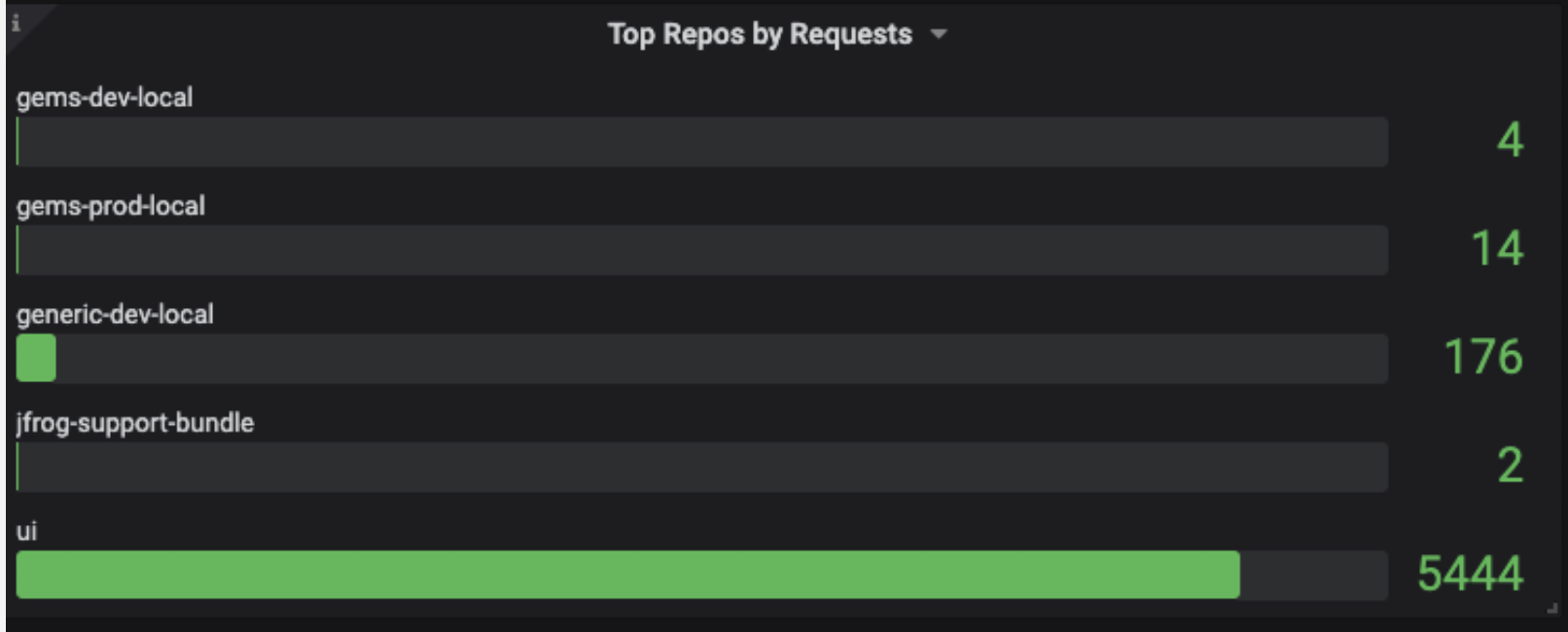 现在Prometheus收集了指标,我们现在可以使用Prometheus的可视化层Grafana对其进行可视化。使用Prometheus的PromQL查询语言,我们可以为仪表板设置查询。例如,以下PromQL提供了请求次数最多的仓库。