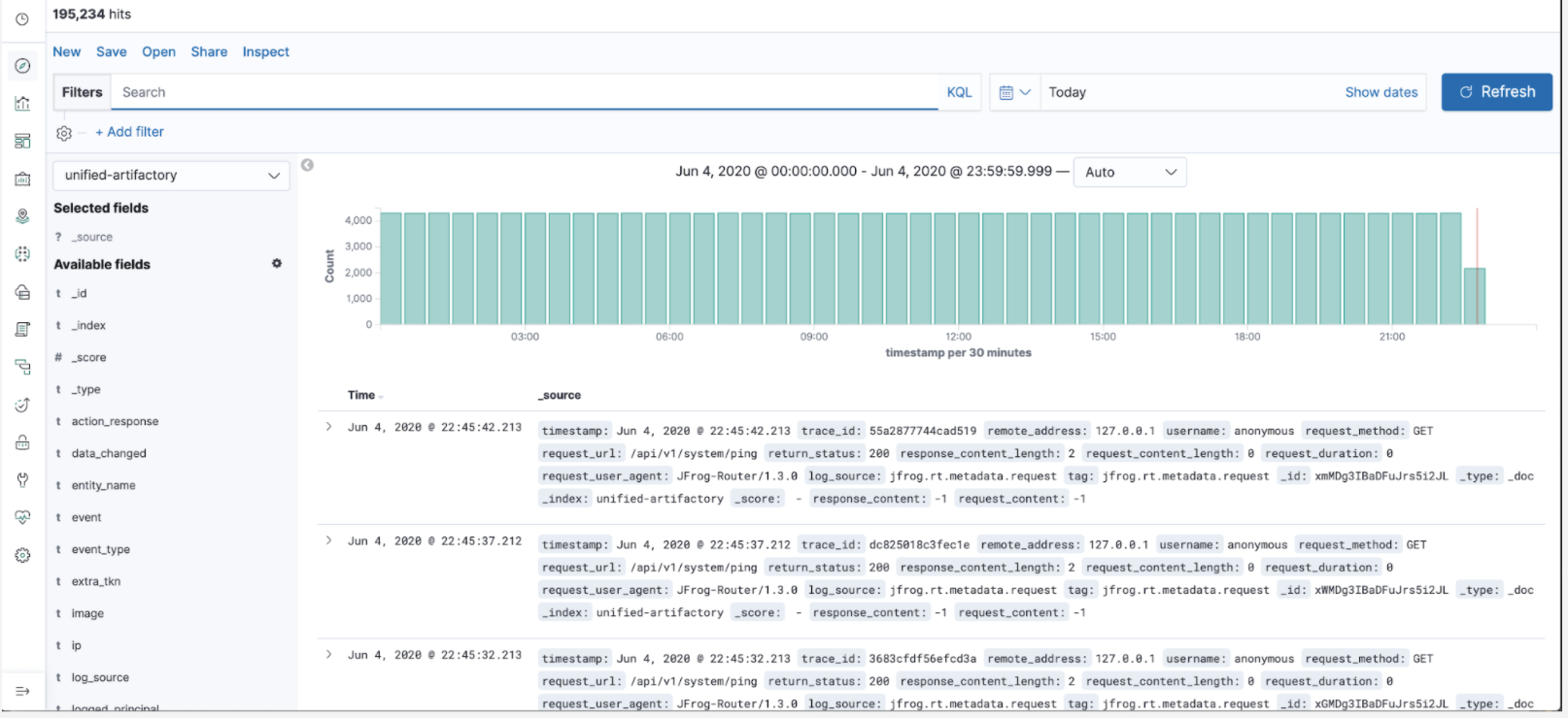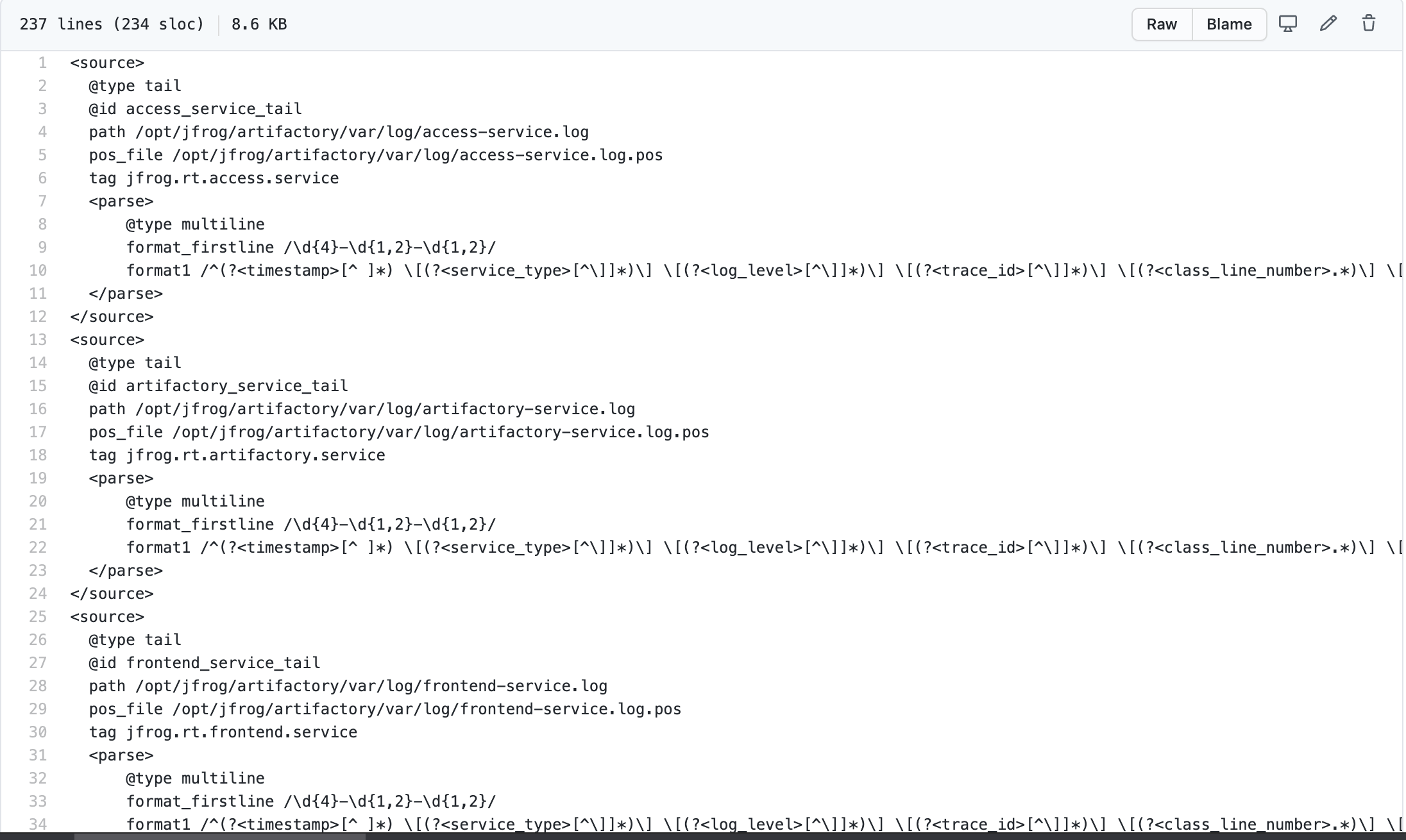 首先使用Fluentd,我们提供了与开源数据收集器Fluentd 的JFrog日志分析集成配置,该集成可随JFrog Platform部署的每个产品实例安装。Fluentd在JFrog平台中为每个产品执行日志输入,字段提取和记录转换,从而将该数据的输出标准化为JSON。