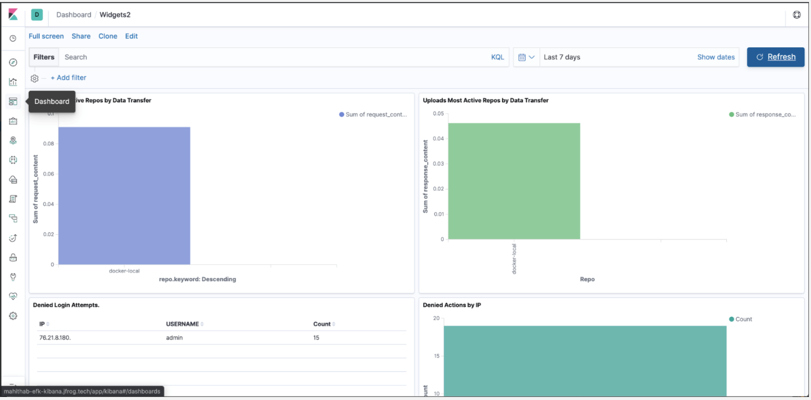 最后,让我们查看仪表板,该仪表板现在包含在数据小部件(Wedgets)中显示的信息,以使您可以实时观察JFrog Unified Platform的日志数据,包含以下数据,如下图: