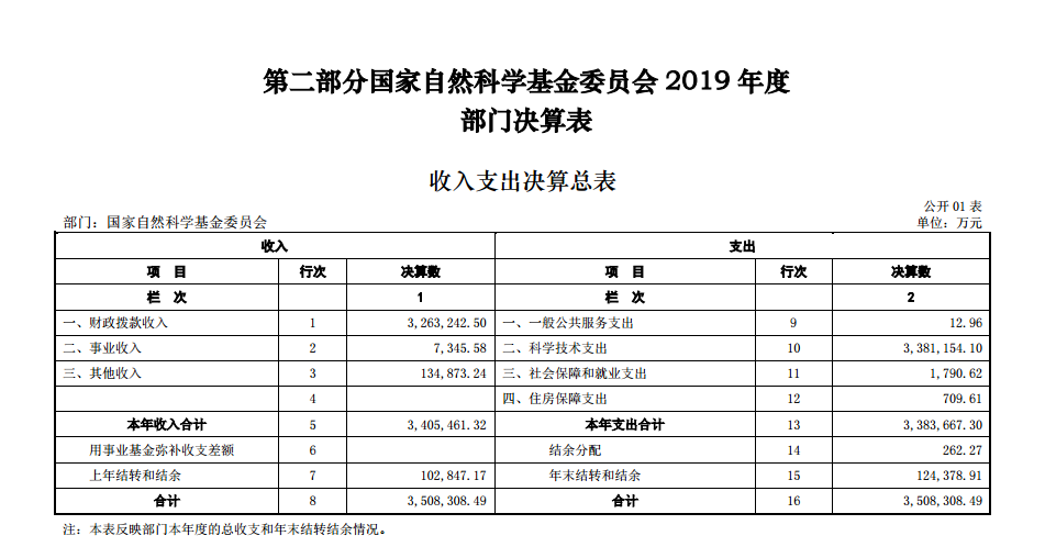 近日,国家自然科学基金委员会官网 「经费决算」 栏目公布了《国家自然科学基金委员会 2019 年度部门决算》。