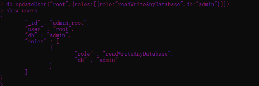 -- 修改root用户的角色为readWriteAnyDatabase