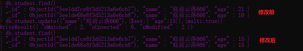 db.student.update({"name":"庭前云落666"},{$set:{ "age":15}},{multi:true})