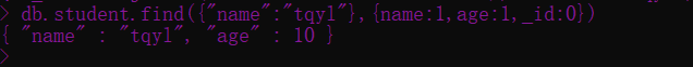 db.集合名称.find(JSON条件,{显示字段名:1 ,不显示字段名:0 , ...}) -- 实例 db.student.find({"name":"tqyl"},{name:1,age:1,_id:0})
