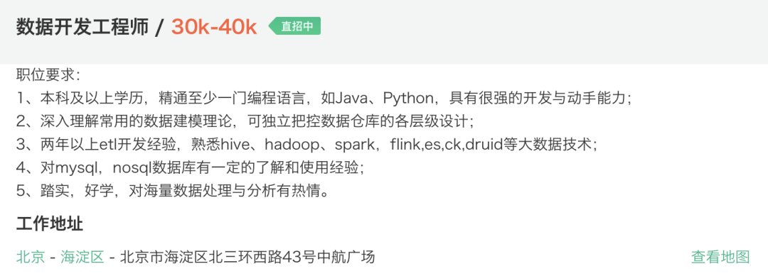 随着物联网、5G的普及,大数据人才会越来越贵,别的不说,至少涨薪幅度能跑得赢通货膨胀。不过正因为薪资高,从事数据开发的任职要求也高,除了基础知识扎实,各种层出不穷的新技术也都要求精通。