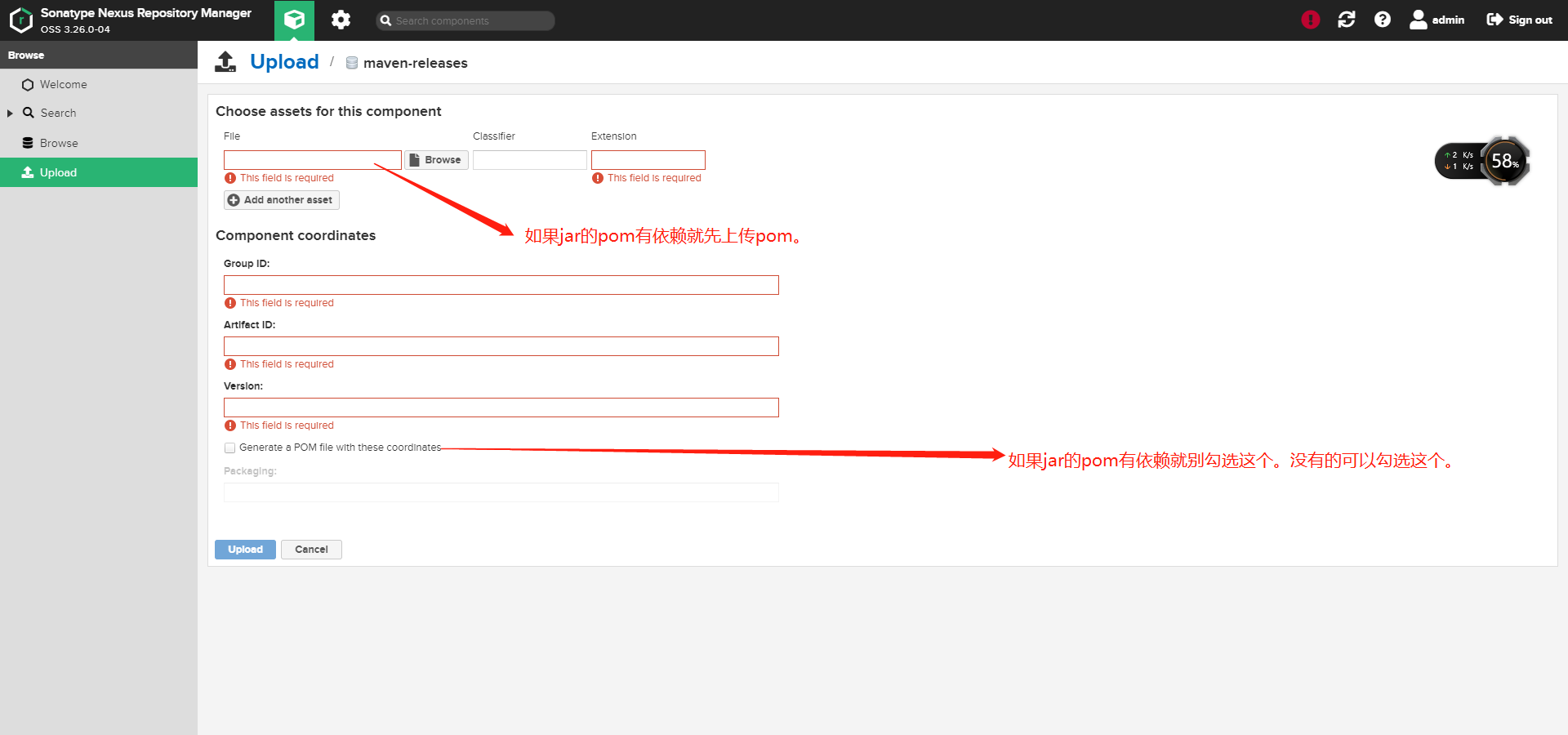 如果是release版的jar直接使用nexus上传即可。需要注意如果pom有依赖一定要先上传pom,再上传jar