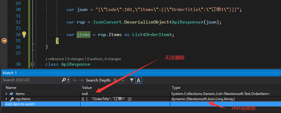 从图中看: rsp.Items as List<OrderItem> 返回是null,尝试失败,虽然转化失败了,但我相信你也看到了 Newtonsoft.Json.Linq.JArray,貌似这玩意可以用 linq 操控,对的, 这就是 linq to json。
