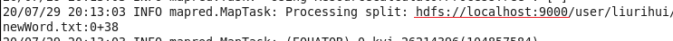 系统在词频分析的时候,我们看系统打印出来的日志,可以看到系统默认会在/user/liurihui/newWord.txt前面加上我们之前在core-site.xml里面配置hdfs路径: