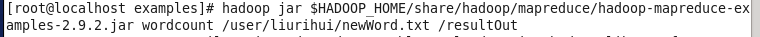 语句的意思:调用hadoop自带的hadoop-mapreduce-examples-2.9.2.jar 里面的wordcount 方法对hdfs里面的/user/liurihui/newWord.txt文档进行词频分析,分析结果存储在hdfs根目录下面的resultOut文件夹,系统会自动创建这个文件夹。