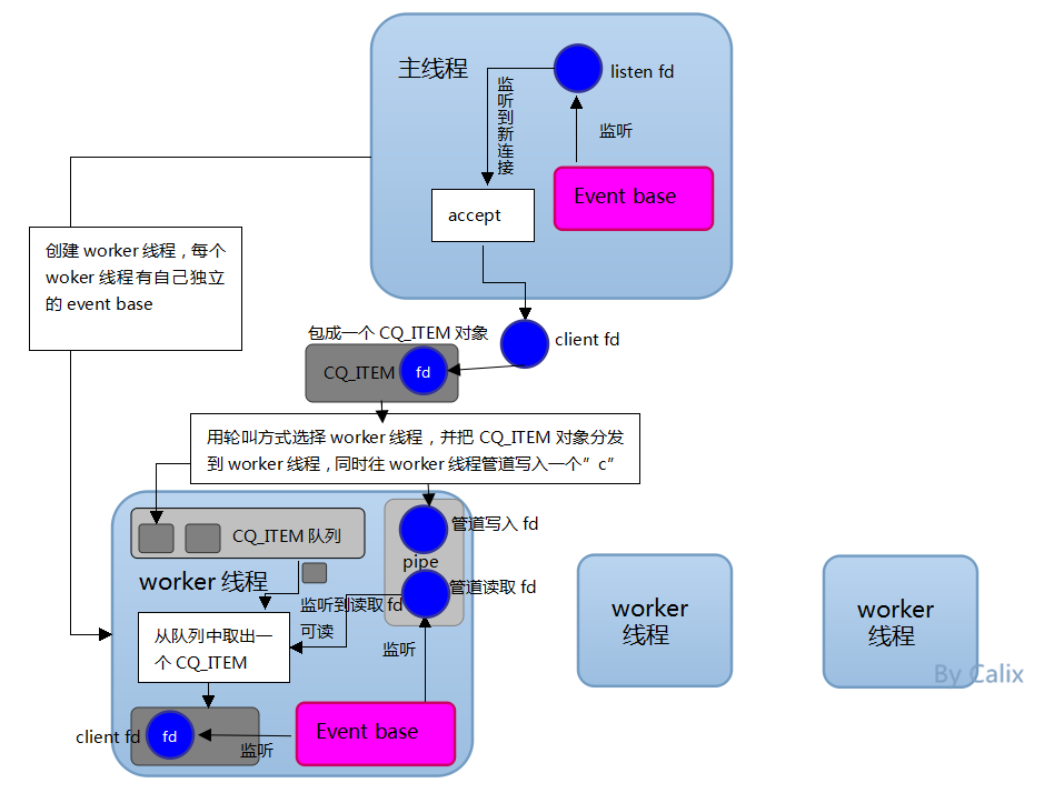 不同点:Memcached 执行主逻辑也是在 Worker 线程里,模型更加简单,实现了真正的线程隔离,符合我们对线程隔离的常规理解。