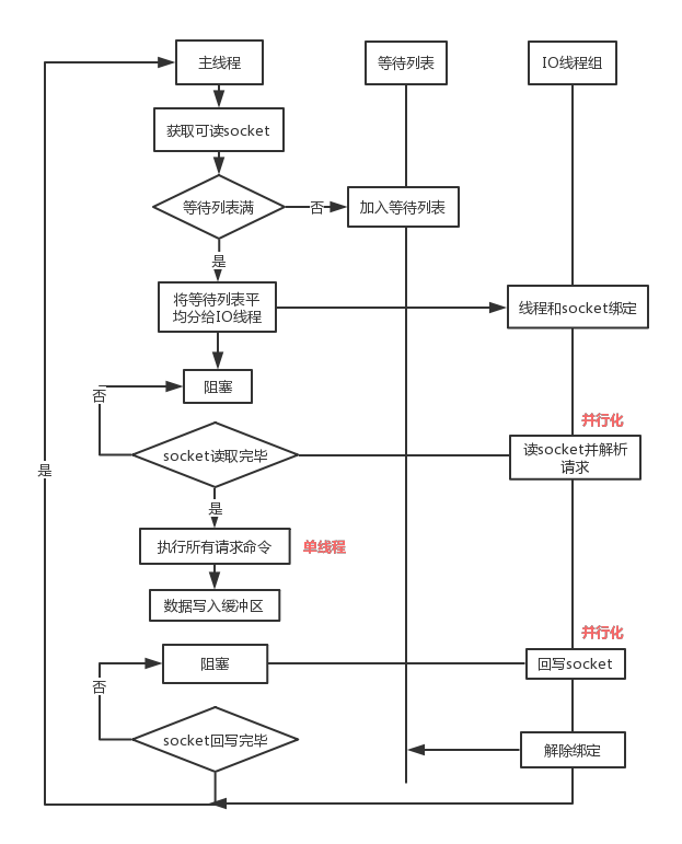 - 主线程通过单线程的方式执行请求命令,请求数据读取并解析完成,但并不执行。