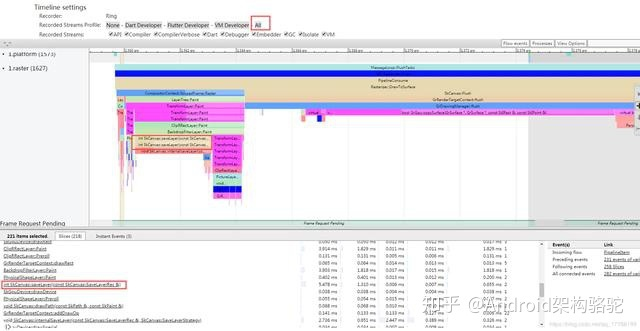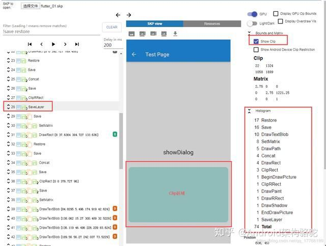 图中可以看到调用了saveLayer方法以及调用次数。利用这个分析工具,可以详细了解页面的绘图过程,便于我们去除不必要的绘制部分,提升性能。