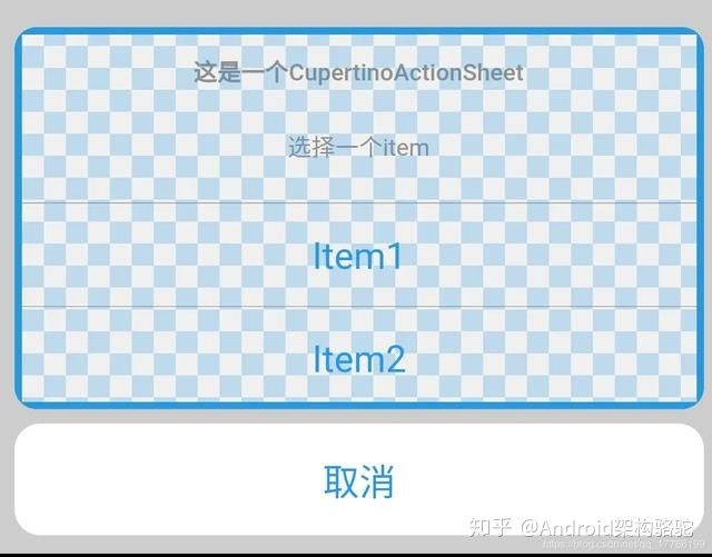 在MaterialApp中添加 checkerboardOffscreenLayers: true 来检查是否使用了 saveLayer(包含显式或隐式调用),如果使用了会有一个"棋盘网格"覆盖在上方。不过很遗憾,目前我只发现对于BackdropFilter的使用可以通过这个直接检查到。下图是使用CupertinoActionSheet的效果: