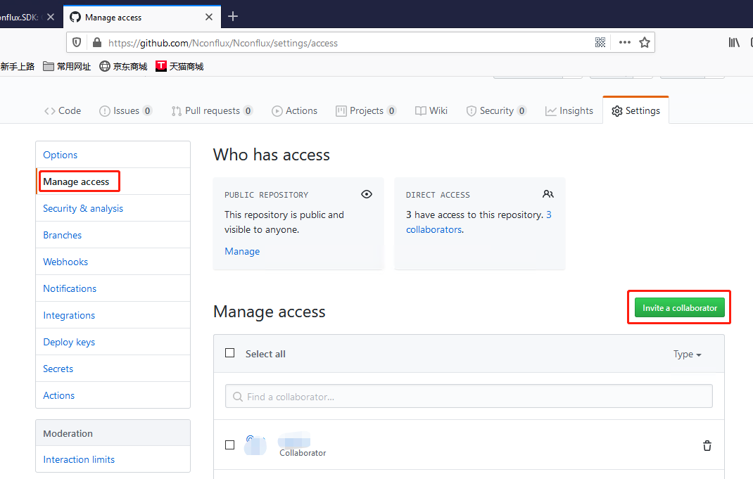 3、上图左侧,并没有网络上可查见的文档中的Collaborators选项,只有了Manage access。下拉,柳暗花明处,看右边有按钮:invite a collaborator。