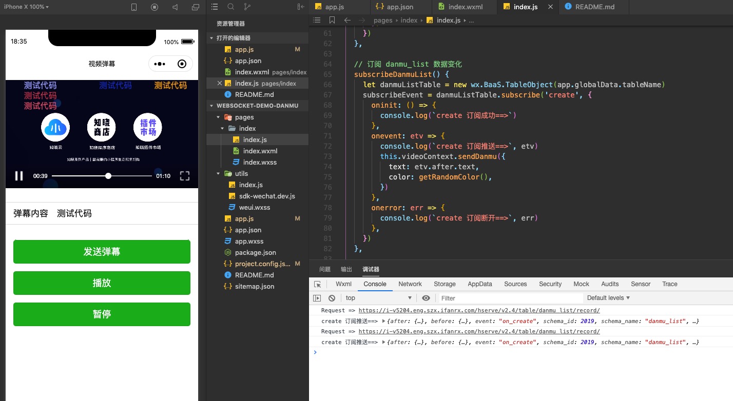 视频弹幕借助「实时数据同步服务」,实时同步数据变化动作(新增、更新或删除)的变化。当用户输入弹幕内容,点击发送弹幕为数据表新增一条弹幕数据,小程序端即可收到新增的数据行,并进行弹幕显示。
