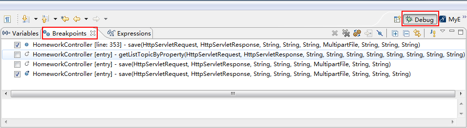正常情况下我们只可以在方法签名(如上图第二处断点)和方法体上设置断点,注释是不可能设置断点的。但是,如果MyEclipse卖了个萌,很 脑抽地让我们把断点设置到了注释上,那么我很负责任地告诉你:上述情况就会出现!(值得一提的是如果没有大幅改动代码,比如从其他地方复制粘贴,上述情况 一般不会出现)