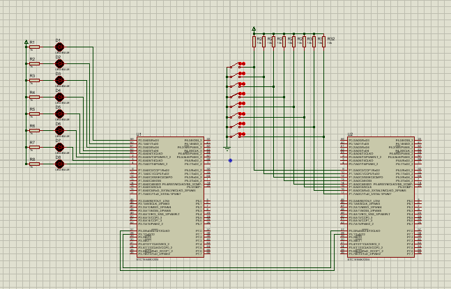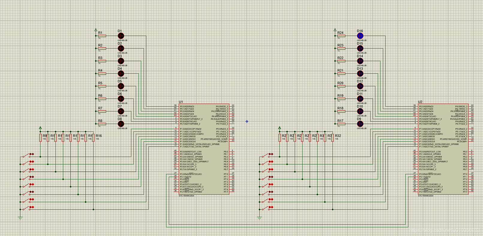 个 LED 灯显示,若校验出错则指示灯(自定义)闪烁。请在 Proteus 中画出电路原理图,
