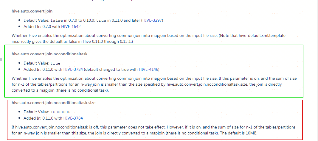 - set hive.auto.convert.join.noconditionaltask = true; 翻译官网的解释:是否启用基于输入文件的大小,将普通连接转化为Map连接的优化机制。假设参与连接的表(或分区)有N个,如果打开这个参数,并且有N-1个表(或分区)的大小总和小于hive.auto.convert.join.noconditionaltask.size参数指定的值,那么会直接将连接转为Map连接。(说人话:默认值:true,当将普通的join转化为普通的mapjoin时,是否将多个mapjoin转化为一个mapjoin,主要针对多个小表join大表的情形)