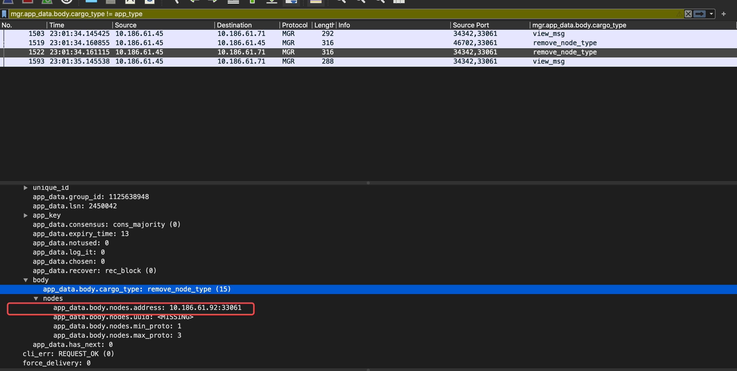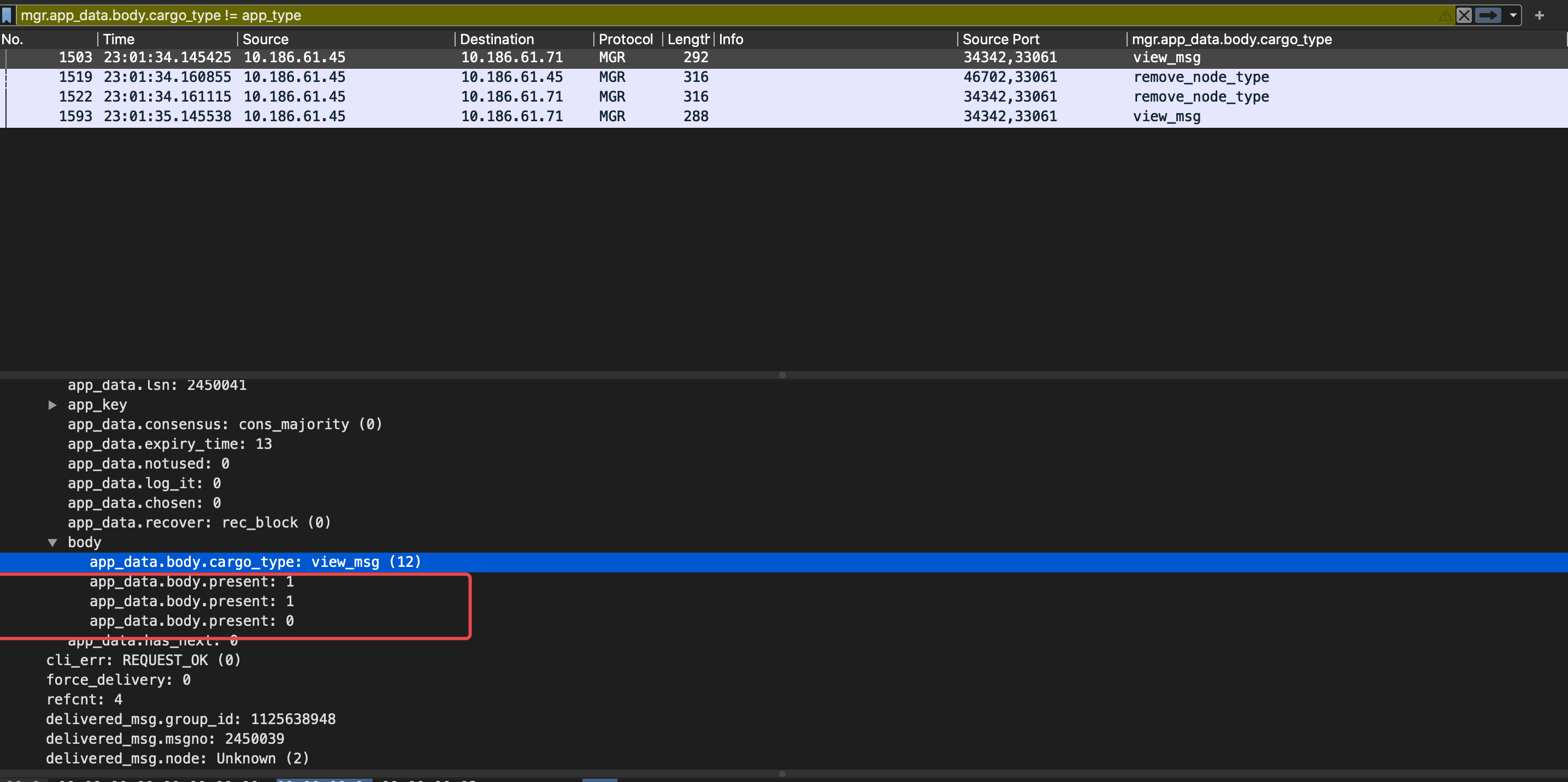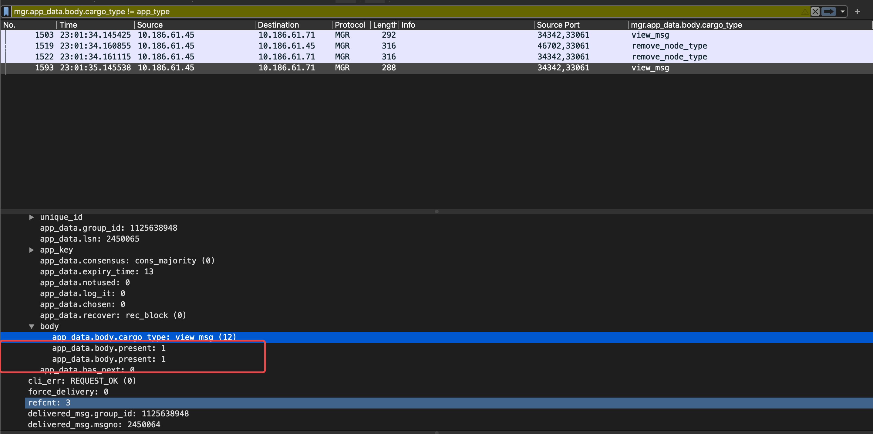 可以看到 MGR 的 Primary(10.186.61.45,也就是 test-mgr-1)向另一个存活节点(10.186.61.71,也就是 test-mgr-2)发送了三个信息,分别是 view_msg,remove_node_type,view_msg。我们仔细看看这三个包的详细信息: