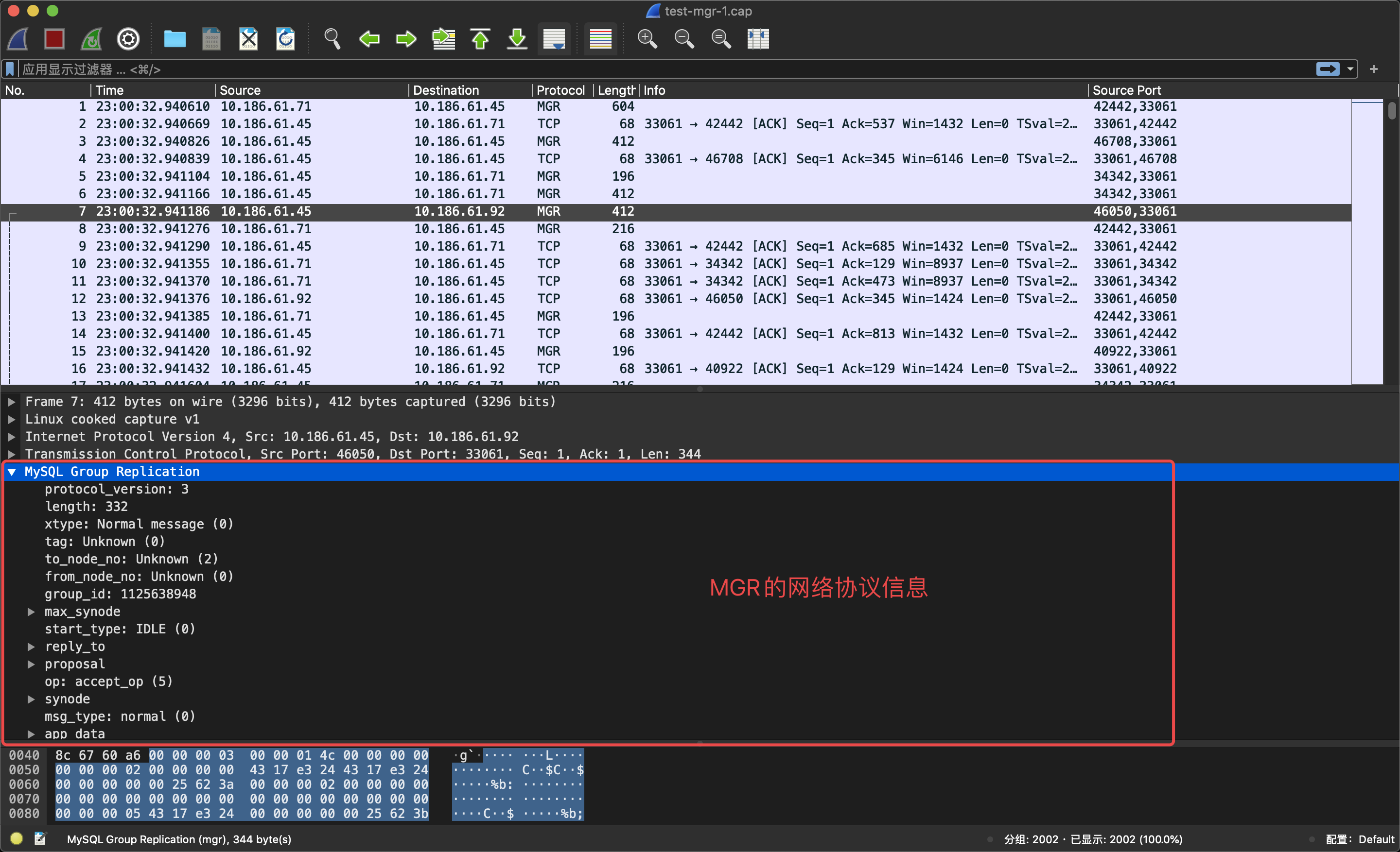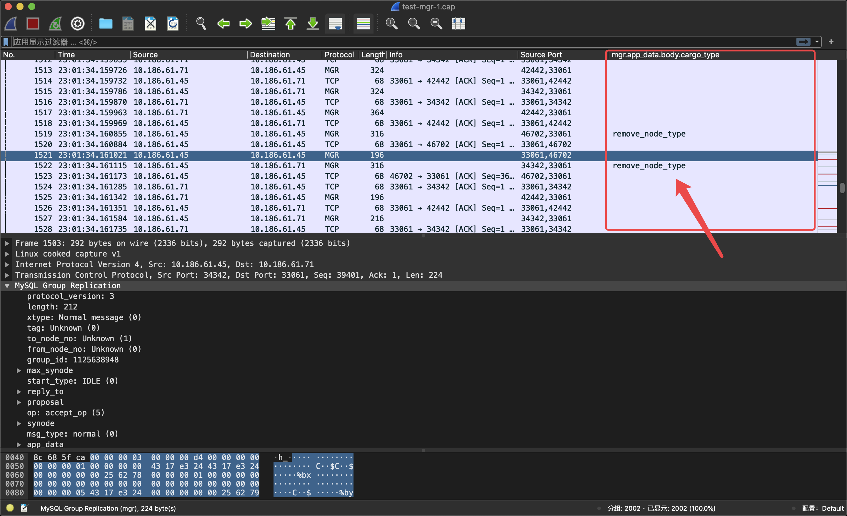 我们在 MGR 的 Primary 节点(test-mgr-1)上抓包: