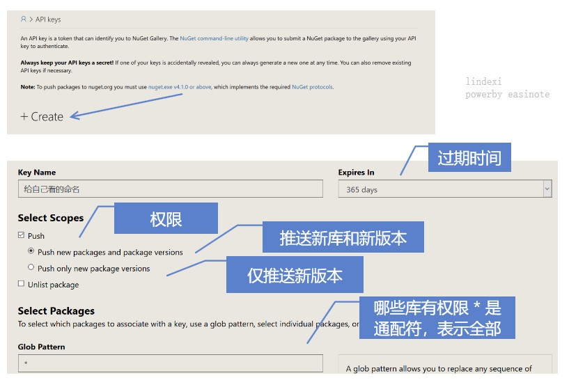 当然,上传到 nuget.org 就需要设置 ApiKey 了,打开 nuget.org 用自己的帐号登录,点击 API keys 设置