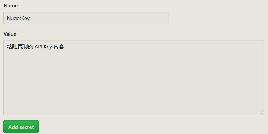 这里的 name 在脚本通过 ${ { secrets.Name } } 替换,这里的 secrets.Name 的 Name 就是输入的 name 如上面输入的是 NugetKey 在使用脚本需要下面代码