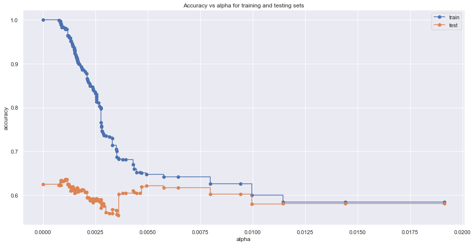 ax.set_title("Accuracy vs alpha for training and testing sets")