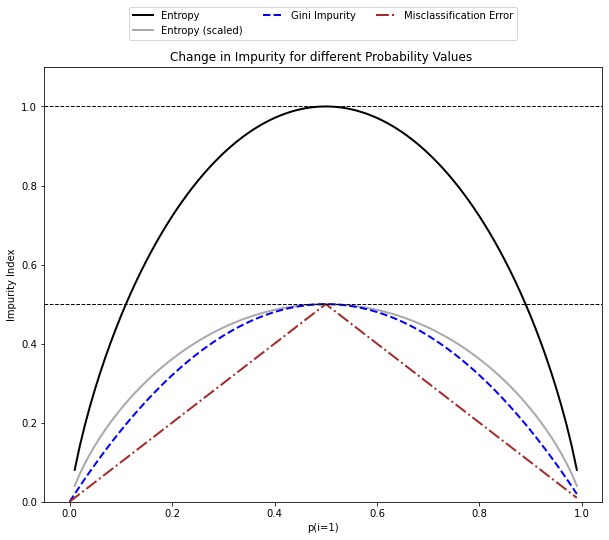 下面概述的代码片段提供了不同不纯度标准的直观比较,以及它们如何随不同的概率值而变化。注意下面的代码改编自Deeper Insights into Machine Learning by S.Raschka, D.Julian, and J.Hearty, 2016。