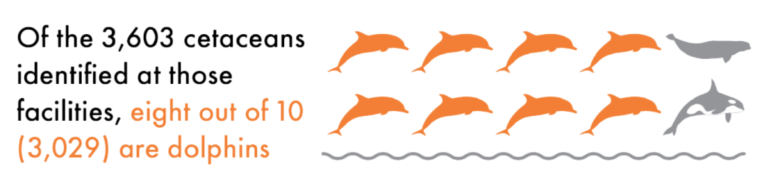 去年年底,世界动物保护协会发布了《“微笑”的背后——全球海豚娱乐业研究》报告,报告显示,在全球范围内有3,603只鲸豚类动物被圈养在58个国家和地区的355家场馆,其中海豚占比超过80%,而且,全球93%的海豚馆都推出了海豚表演项目。