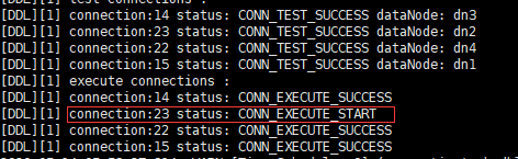 日志中可以很明显的看出,步骤一验证连接都成功完成了,但其中一个节点执行语句的状态一直处于 start。
