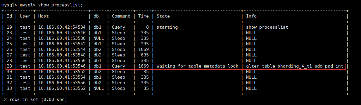 分析步骤三:连接日志中提示的出问题的 mysql 节点上,执行 show @@processlist