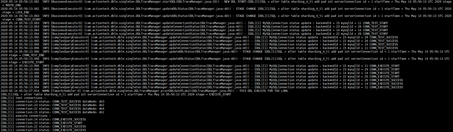 从上面的信息我们大概可以看出,这个语句要发往 4 个分片,且这条 ddl 在 dble 执行中包括 2 个步骤。